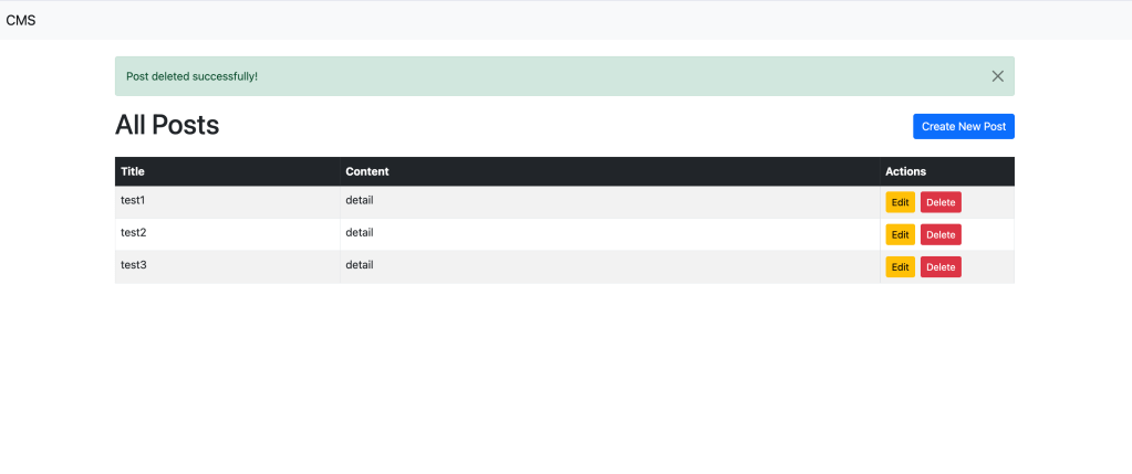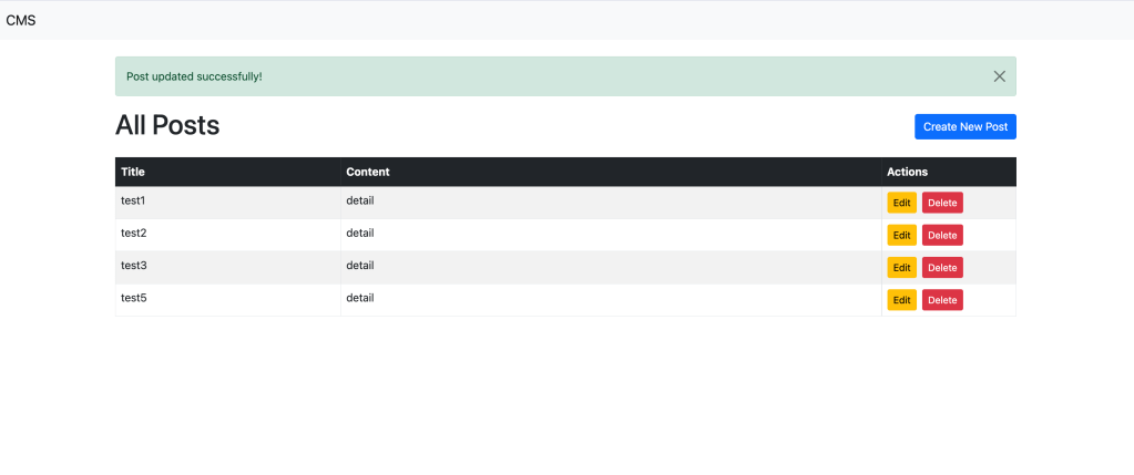 The CMS provides all essential CRUD functionality for managing posts. Users can easily create new posts, view them in a clean, responsive table, edit content, and delete posts from the interface. - Bootstrap-Powered UI