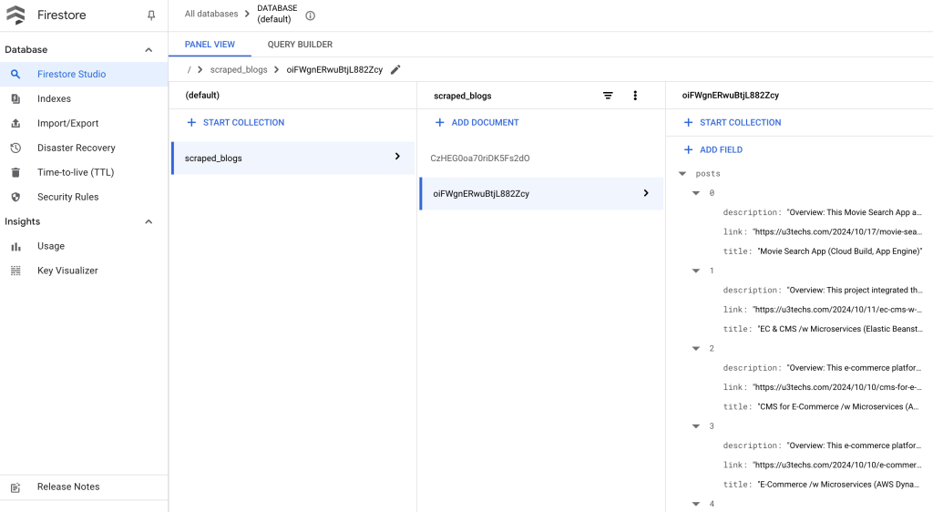 - Firestore is a NoSQL document database that stores the scraped data in a structured format. Each scraped data set is stored as a document in a Firestore collection, making it easy to retrieve and manage.