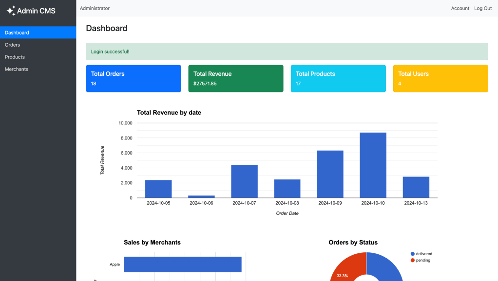 - A dashboard for administrators that includes insights into Total Revenue, Sales by Merchants, and Order status.